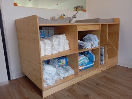 Ce meuble " Table à langer " à été conçu pour les professionnels de la petite enfance .