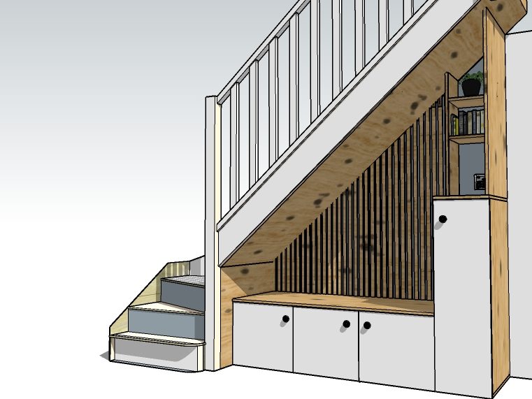 L'agencement sous cet escalier à été conceptualisé dans un premier temps par visualisation 2D/3D afin d'obtenir un rendu qui conrespondant parfaitement à l'attente du client.